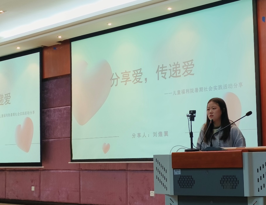 刘煌翼同学就她在四川内江儿童福利院社会实践活动进行分享。她分析了福利院儿童的现状,提出了福利院儿童与社会联系较少、身心发展受限、成年后难以融入社会的问题。随后她为在场同学讲述了活动准备与过程,如何了解福利院儿童生活与心理健康现状,在玩乐与授课中帮助他们建立与社会的联系,同时帮助他们掌握与人沟通交往的能力和基本生活常识。刘煌翼同学展示了她在福利院活动的课堂剪影,并对活动进行了反思,希望能利用自己的心理学专业知识给予孩子们心理健康发展方面的帮助。