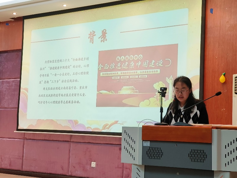 回颖琦同学为大家介绍了心理学部暑期“三下乡”社会实践活动。为贯彻落实党的二十大“全面推进乡村振兴”“推进健康中国建设”的方针,心理学部的两支队伍分别赴云南省昌宁县、重庆市北碚区龙凤桥街道等地开展关爱留守儿童、呵护老年人心理健康等志愿服务活动。在活动中,同学们关注留守儿童与老年人的心理健康问题,传播红色文化,展现使命担当。回颖琦同学还分享了活动中与儿童和老人们的温暖画面。