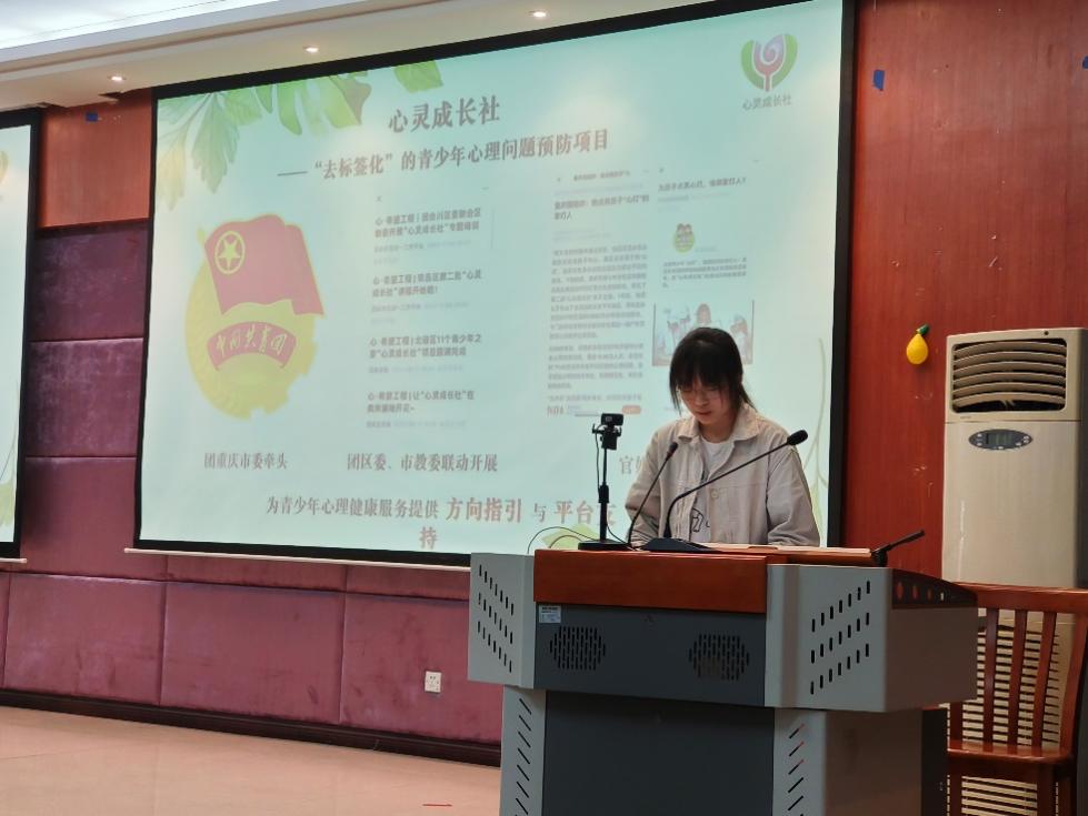 心灵成长社是一项“去标签化”的青少年心理问题预防项目,该项目旨在为青少年心理健康服务提供方向指引与平台支持。靳蕊宁同学详细地介绍了心灵成长社的青少年团辅活动,在活动中,孩子们可以通过绘画、手工、表演、发言等艺术形式进行多元化的自我剖析与心理表达,在阳光下进行自我疗愈。同时,靳蕊宁同学呼吁大家,在青少年的心中种花,呵护青少年身心健康成长,展现我们的青春担当!