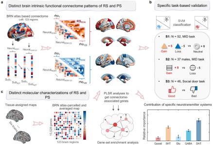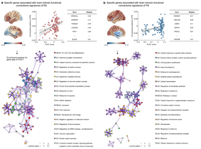 再次,影像—转录组学揭示的基因富集通路:将大脑功能连接模式与全脑基因表达图谱进行空间映射后,研究发现与 RS/PS 相关的脑连接组变化对应于特定基因集合的空间分布,这些基因在突触传递、多巴胺代谢、免疫反应和应激适应等通路中富集,指示了脑连接组差异的分子-功能基础(见图2)。