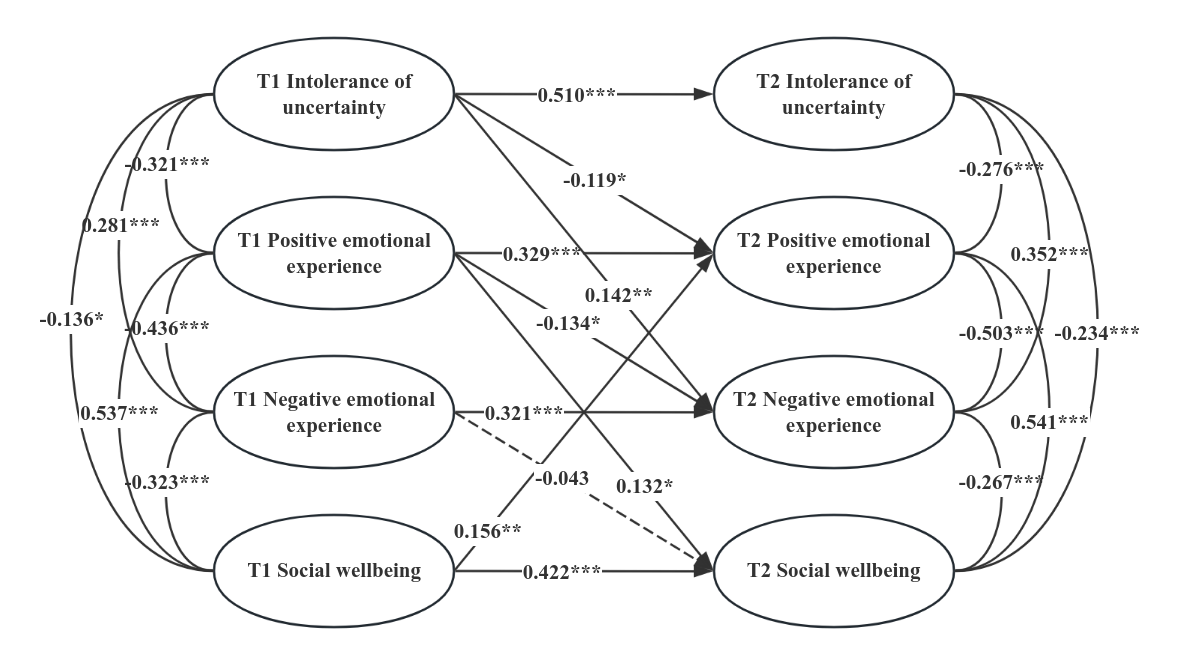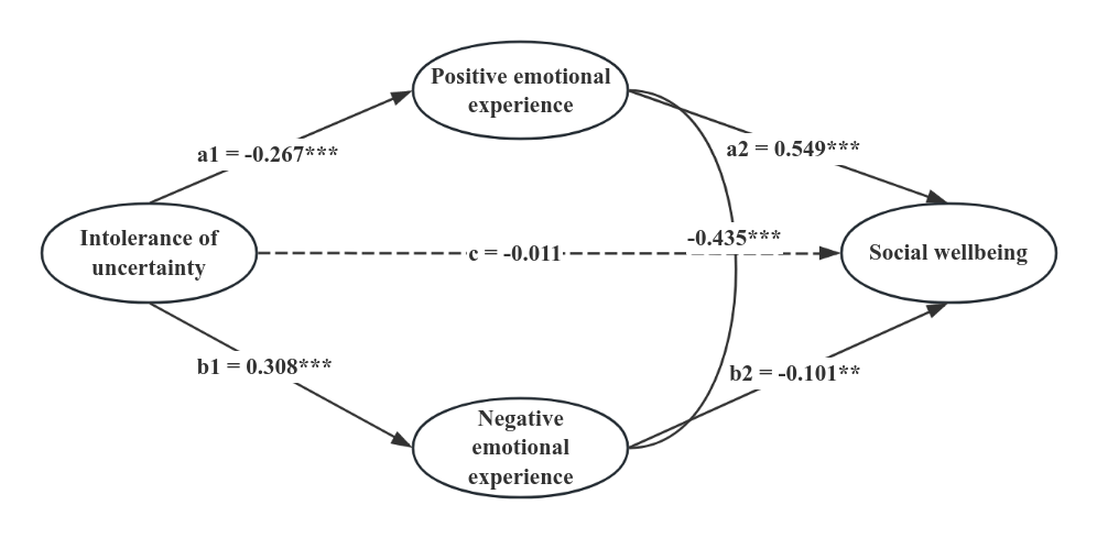 研究基于844名大学生的横断面数据和324人的两年追踪样本,发现不确定性容忍度越低,个体越容易经历更多负面情绪、更少积极情绪;积极情绪和消极情绪在不确定性容忍度与社会幸福感之间起到中介作用(图2)