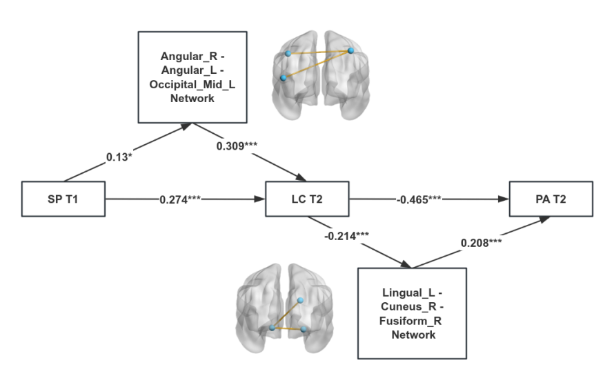 脑功能连接分析进一步发现,右侧角回与左侧枕中回的功能网络在社交恐惧发展为失控感中起中介作用;而左侧舌回与右侧楔叶、梭状回的功能连接则在失控感影响积极情感中发挥作用