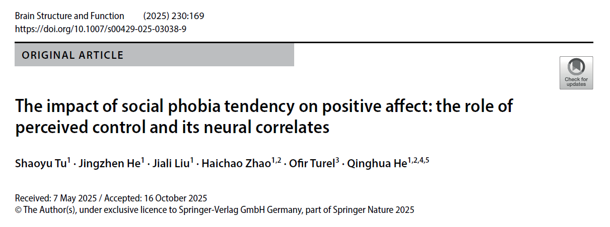 另一项发表于《Brain Structure and Function》(图4,SCI收录,解剖与形态学领域1区期刊,五年影响因子3.2)的研究《The Impact of Social Phobia Tendency on Positive Affect: The Role of Perceived Control and Its Neural Correlates》,则从脑科学角度揭示了社交恐惧影响积极情感的认知与神经路径
