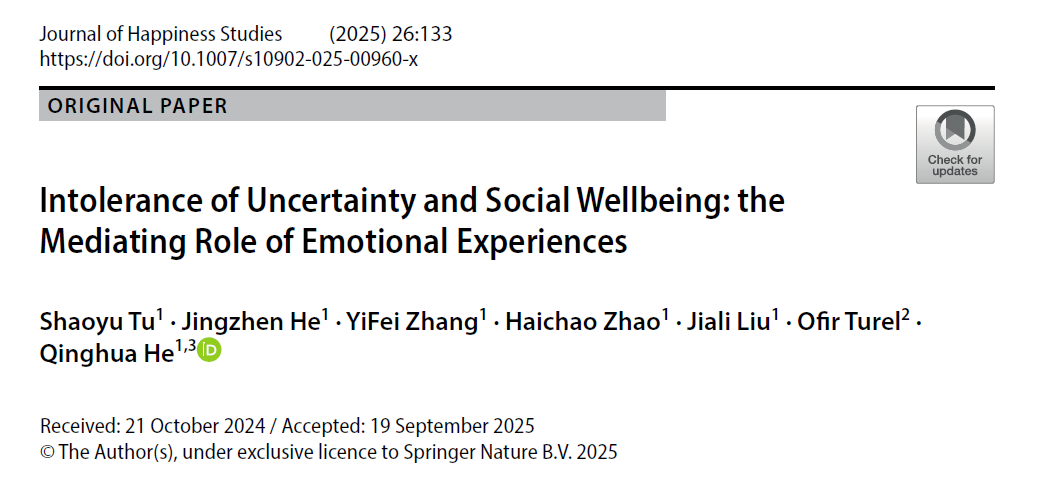 发表在《Journal of Happiness Studies》(图1,SSCI收录,五年影响因子4.7)上的论文《Intolerance of Uncertainty and Social Wellbeing: The Mediating Role of Emotional Experiences》首次系统探讨了“不确定性容忍度”如何通过情绪体验影响个体的社会幸福感