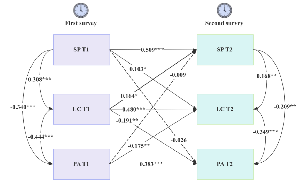 纵向分析进一步证实,早期的积极情绪能够预测两年后的社会幸福感,显示出积极情绪在长期心理健康中的关键作用(图3)
