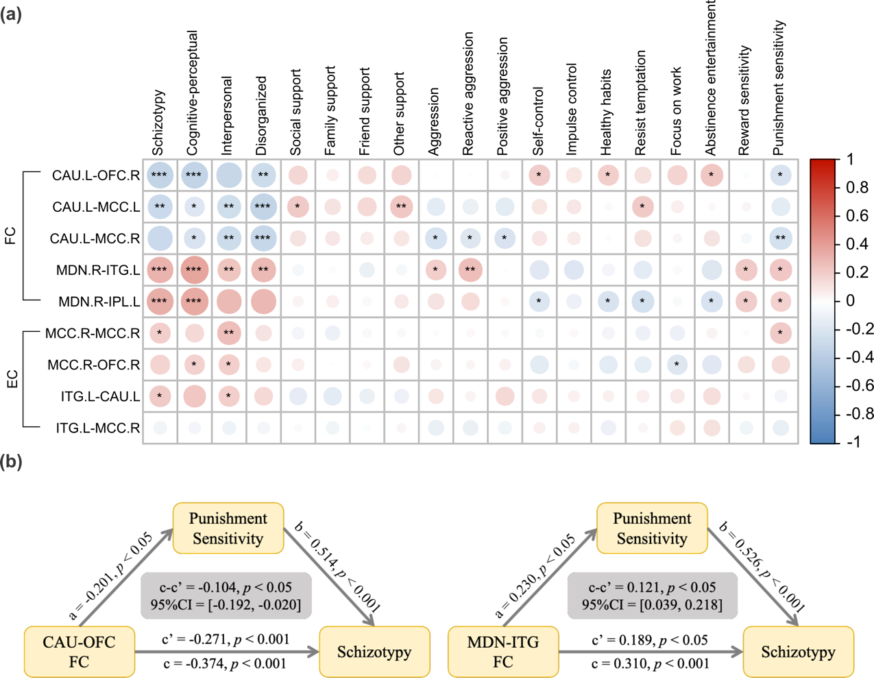 图2 (a) 神经连接与心理变量相关结果;(b)中介模型