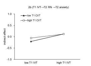 图1 T1个体受害通过T2关系需求满足对T2焦虑(2b)和T2抑郁(2c)的条件间接效应。