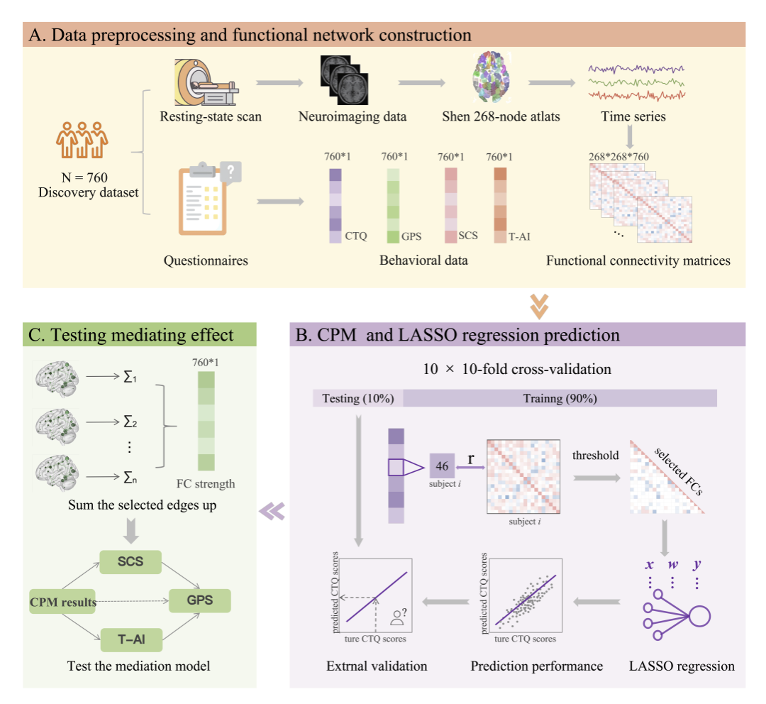 图1 研究框架图:A. 行为与脑成像数据的收集流程。首先采集静息态功能磁共振成像数据,并将其映射至 Shen 268节点脑区模板,以提取个体的功能连接矩阵。同时,使用标准化量表评估行为数据,包括童年创伤量表(CTQ)、自我控制量表(SCS)、特质焦虑量表(T-AI)和一般拖延量表(GPS);B. 采用CPM和LASSO回归构建童年创伤(CTQ)的预测模型;C. 在神经标志物框架下进行中介分析,用以检验创伤相关脑网络与行为变量之间的中介作用路径。