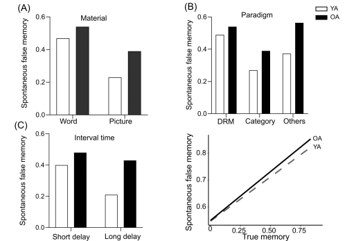 图1. 自发性错误记忆年老化效应的调节因素(材料、范式、间隔时长、真实记忆)