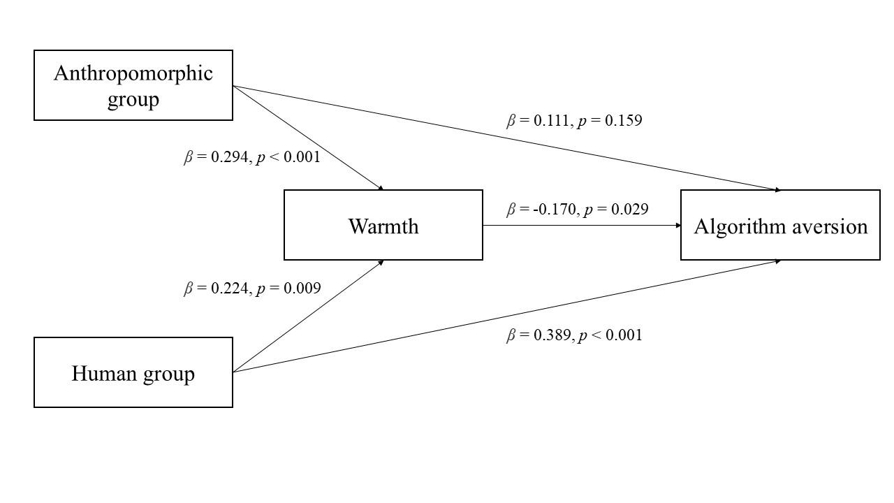 研究结果揭示了拟人化效应的关键边界条件。进一步分析揭示了经验的关键调节作用。在无直接互动经验时(Study 1),温暖感显著中介了拟人化对算法厌恶的影响(间接效应值为0.294,95% CI [0.119, 0.455])。然而,在获得直接互动经验后(Study 2),拟人化组与非拟人化组在温暖感和能力感上均无显著差异,因此中介效应不再成立。这一对比表明,拟人化的作用高度依赖于用户的使用阶段。