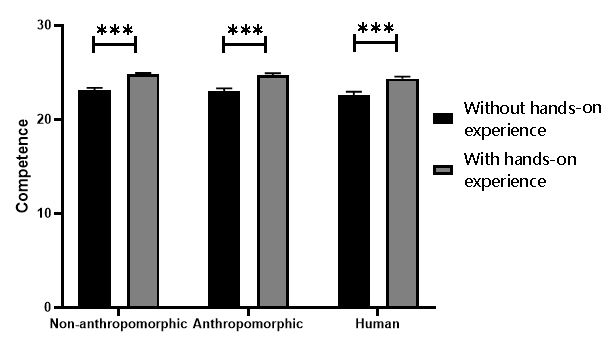 进一步的纵向对比分析发现,无论AI是否被拟人化,与AI的直接互动本身就能普遍提升用户对其能力和温暖感的评价,并增加对AI建议的实际采纳(即更高的建议采纳权重)。相比之下,人类顾问的建议采纳权重始终低于AI,验证了在客观任务中“算法欣赏”的存在。重要的是,互动经验显著调节了拟人化对温暖感和建议采纳的影响:对于非拟人化AI,获得经验后其温暖感评分显著提升,同时,无论是否拟人化,与AI互动本身均能普遍提升用户对AI能力感的评价。这些发现共同说明,直接经验能够重塑用户的感知,弱化拟人化等表面线索的作用(图3)。